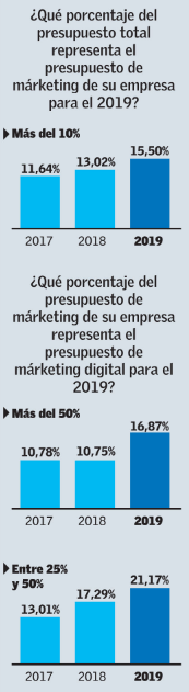 Casi el 29% de los encuestados dicen que en los últimos 12 sus áreas de márketing han incorporado nuevas personas, cuatro puntos más que el año anterior. Además, el 73% dice que gastará más en publicidad en redes sociales, 69% en sitios web y 68%, en técnicas para posicionarse mejor en motores de búsqueda (search engine optimization, SEO). Los consultados señalan además que en 2019 los consumidores estarán más preocupados de los precios: el 28% dice que será su prioridad para este año, dos puntos más que en 2018. No obstante, el servicio fue el que más creció, de 21 a 26% en el último calendario. Los cuestionarios fueron respondidos a inicios de marzo por 406 ejecutivos, de los cuales el 42% son dueños o gerentes generales de las empresas que representaron. En más de 54% trabajaban en empresas con ventas anuales por sobre las UF 100.000 (US$ 4 millones).