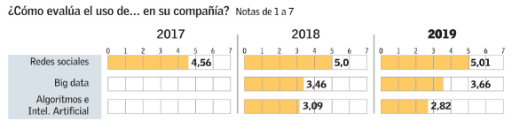 De hecho, el gasto de márketing como proporción del presupuesto global de la empresa ha ido creciendo sistemáticamente en los últimos años. Mientras en 2017 sólo 11,64% decía que este ítem representaba el 10% o más de los costos, ese porcentaje ahora llega al 15,5%. Además, el porcentaje de quienes dicen que lo digital pasó de representar más del 50% de su presupuesto de márketing pasó de 10,78% a 16,87%. Si bien las empresas se ponen buena nota en cómo lo están haciendo en redes sociales (un 5 en la escala de 1a 7), reprueban con un 3,7 en la gestión de altos volúmenes de datos (big data) y con un 2,8 en el uso de inteligencia artificial y algoritmos para sus negocios. Estos mayores desafíos irán acompañados de una demanda de mayores recursos.